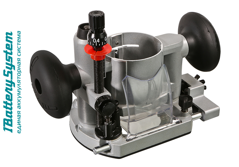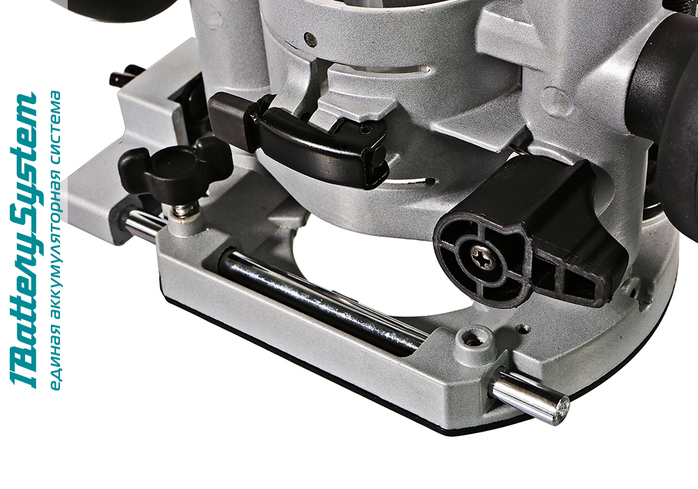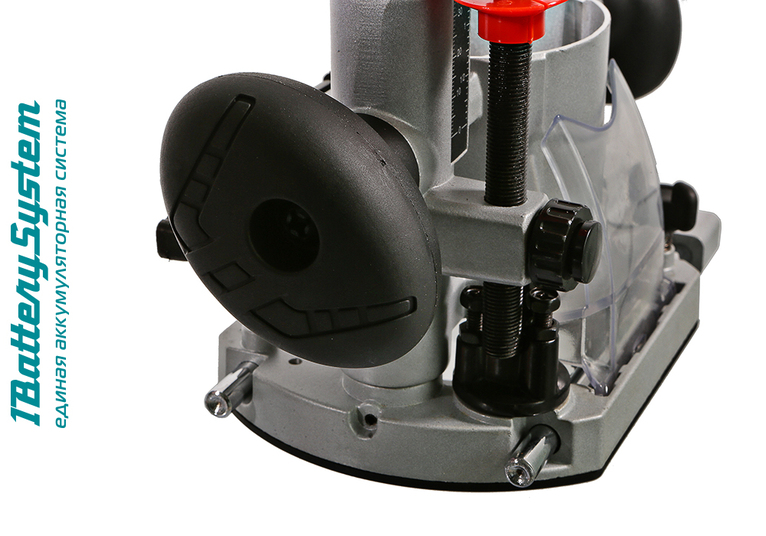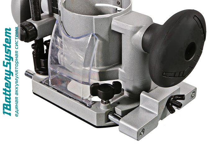 Инструмент имеет систему плавного пуска, а также функцию регулировки скорости вращения оснастки в диапазоне от 10000 до 30000 об / мин, что позволяет эффективно и качественно обрабатывать материалы различной твердости и использовать различные виды фрез. Модель максимальна проста в эксплуатации, в том числе и благодаря специальному быстрозажимному устройству, позволяющему производить смену баз на инструменте за пару движений, исключая лишние затраты времени на подготовительные операции. Также, конструкцией предусмотрен блокиратор вала, способствующий быстрой смене оснастки без вспомогательного инструмента. Дополнительный комфорт при работе обеспечивают эффективная LED подсветка рабочей зоны, а также штатный пылеотвод, предоставляющий возможность подключения к фрезеру строительного пылесоса. Для безопасности пользователя модель имеет защиту от случайного включения – запуск возможен лишь после предварительного нажатия на клавишу разблокировки. Для удобства хранения и транспортировки служит прочный матерчатый кейс.