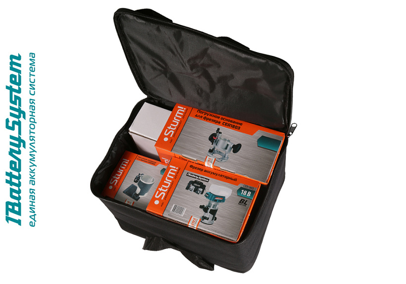 * 1BatterySystem — универсальная аккумуляторная система. Подходит ко всей линейке аккумуляторного инструмента Sturm! Сменные батареи будут в продаже в течение 15 лет * Инструмент 3 в1! В комплекте 3 основания — кромочное, наклонное, погружное для выполнения всего спектра работ доступного фрезеру, а также 2 фреза 6 мм и 8 мм