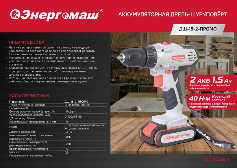 Дрель аккумуляторная Энергомаш ДШ-18-2-ПРОМО — выгодная компактная модель подходит для выполнения всех видов работ по беспроводному сверлению и установке крепежа.