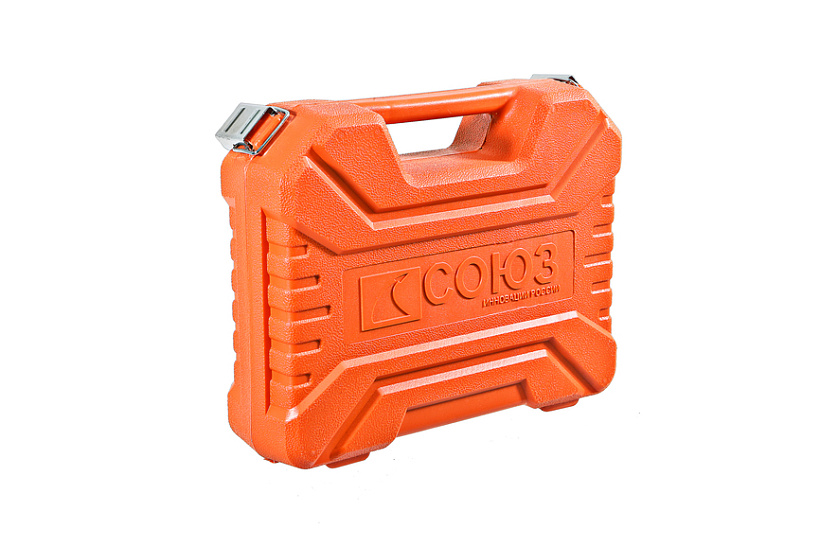 Прочный пластиковый кейс, страховочный ремешок, карабин-защелка и набор бит в комплекте.