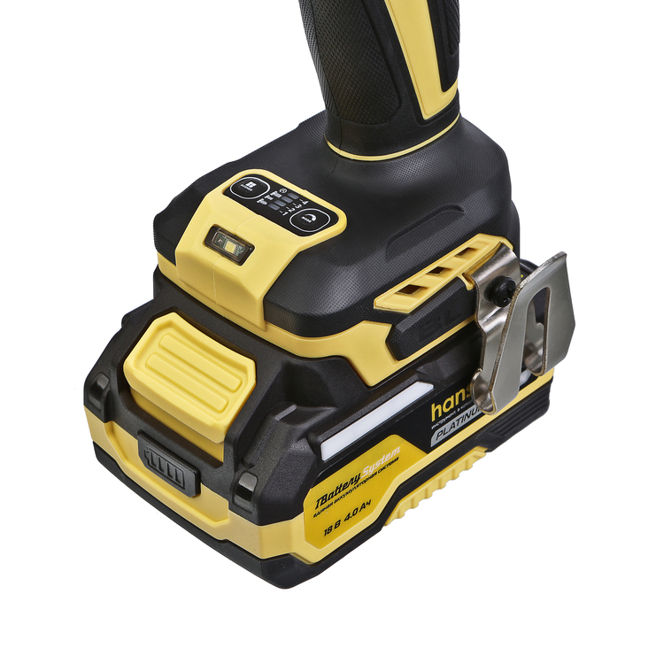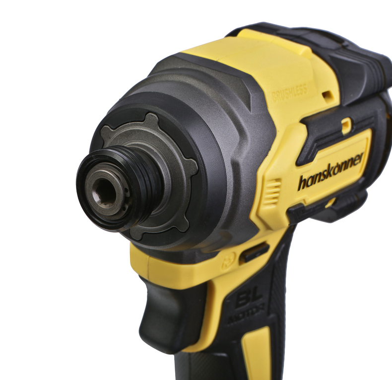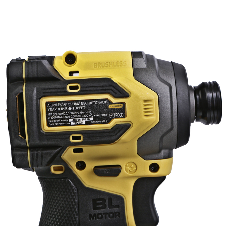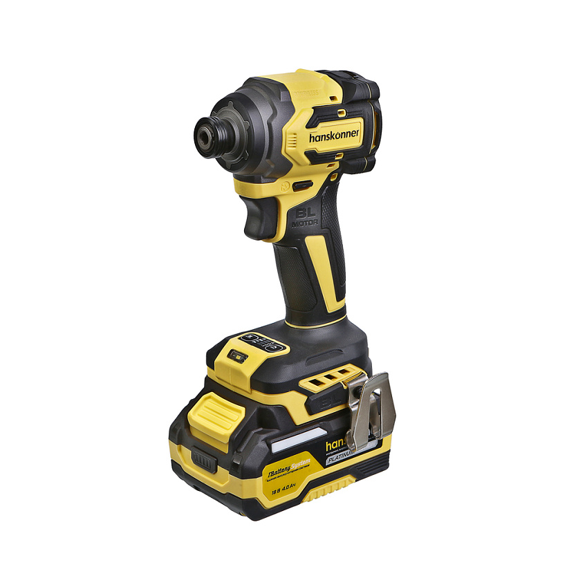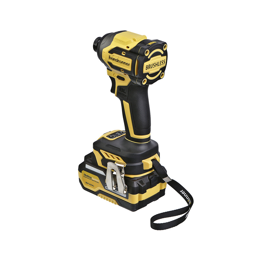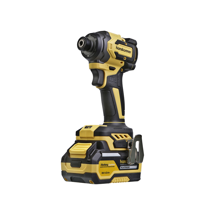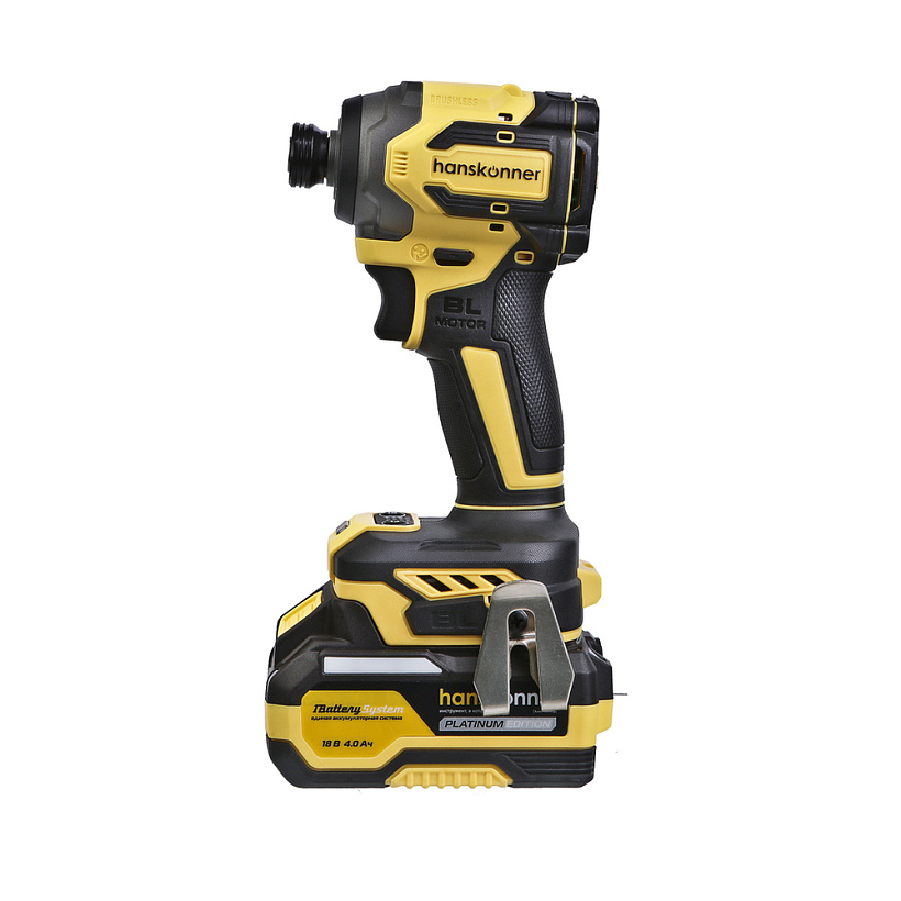 Hanskonner HCD20280BLС – аккумуляторный 18 В, ударный винтоверт с типом гнезда под шестигранник 1/4 ″ – является частью системы 1BatterySystem, обеспечивающей совместимость одного и того же аккумулятора с целым рядом наименований инструмента. Модель обладает максимально сбалансированной компоновкой: небольшие размеры корпуса и рукояти позволяют эффективное использование в условиях с затрудненным доступом, а нейтральный центр тяжести, и обилие прорезиненных противоскользящих поверхностей способствуют надежному хвату, и лучшему контролю. Винтоверт оснащен 18 В бесщеточным двигателем, характеризующимся на 30% лучшей производительностью в сравнении с коллекторными аналогами. Кроме того, бесщеточный двигатель отлично справляется с кратковременными перегрузками и не склонен к перегреву. Благодаря применению мощного планетарного механизма, Hanskonner HCD20280BLС уверенно демонстрирует высокие показатели крутящего момента (до 280 Н м), что позволяет работать с крепежом большой длины и диаметра. Винтоверт имеет четыре режима настройки момента затяжки: 60 Н м, 120 Н м, 180 Н м, 280 Н м – пользователь выбирает нужный, исходя из конкретного материала и крепежа. Модель оснащена функцией AutoStop, плавно останавливающей вал шпинделя сразу после откручивания крепежа. К особенностям Hanskonner HCD20280BLC стоит отнести эффективную LED-подсветку рабочей зоны WorkingLight с блоком коллиматорных линз, создающих направленный симметричный луч, а также индикатор остаточного заряда аккумулятора PowerCheck. Дополнительному комфорту использования способствуют специальная зацепная скоба крепления на пояс и страховочный ремешок на руку. Винтоверт штатно комплектуется литий-ионным (Li-ion) аккумулятором емкостью 4.0 А ч с возможностью подзарядки от него через USB выход сторонних гаджетов, импульсным зарядным устройством, USB LED-фонарем, запитываемым от АКБ. Прочный кейс единой системы хранения инструмента HANSTORAGE гарантирует сохранность устройства и аксессуаров в процессе транспортировки.