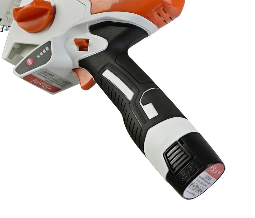 Эргономичная рукоять с противоскользящей прорезиненной поверхностью гарантирует надежный хват для комфортной работы с пилой. Индикатор заряда аккумулятора — для лучшего контроля работы с инструментом.