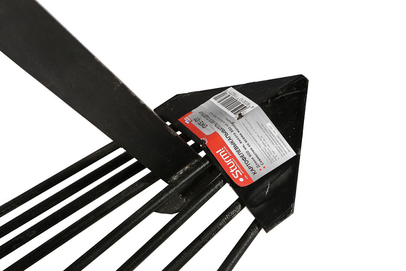 Картофелевыкапыватель для мотоблока без сцепки Sturm! GKE-01 - универсальная картофелекопалка, которую еще называют стрельчатая, веерная или сердце, напоминает лопату с приваренными прутьями. Картофелекопалка подрывает острым концом грунт посредине рядка, и клубни картофеля, свеклы или другого корнеплода попадают на зубцы. После этого лишняя почва стряхивается, а клубни остаются на поверхности. Расстояние между зубцами не превышает размеры маленького клубня картошки.