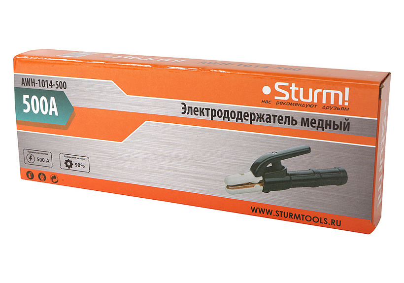 Электрододержатель 500А Sturm! AWH-1014-500 предназначен для фиксации электрода при ручной электродуговой сварке. Максимальный сварочный ток 500А. Тип пружинный.