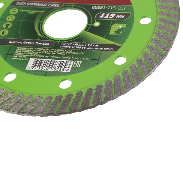 Диск алмазный TURBO с сегментированным алмазным слоем позволяет работать с широким спекторм строительных материалов, натуральными и искуственными камнями и способен прорезать тонкую арматуру в бетоне. Сухой рез. Охлаждение водой увеличивает ресурс диска. Self-sharpening technology -Технология самозаточки позволяет диску сохранять высокую скорость реза даже при длительной работе. Тело диска из стали марки 65Mn и метод горячей опрессовки при производстве алмазных дисков увеличивает его износостойкость и срок эксплуатации. Правильно подобранные компоненты металлической связки обеспечивают постепенный равномерный износ алмазного слоя.