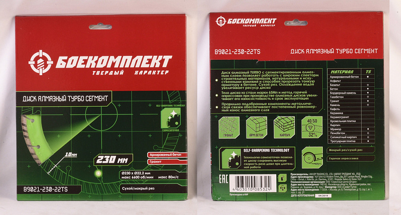 Специальная серия алмазных дисков сегментного типа с сегментированным алмазным слоем позволяет работать с армированным бетоном, искусственным и природным камнем. Предназначен для сложных работ с материалами неоднородного состава. Сухой рез. Охлаждение водой увеличивает ресурс диска. Self-sharpening technology -Технология самозаточки позволяет диску сохранять высокую скорость реза даже при длительной работе. Тело диска из стали марки 65Mn и метод горячей опрессовки при производстве алмазных дисков увеличивает его износостойкость и срок эксплуатации. Правильно подобранные компоненты металлической связки обеспечивают постепенный равномерный износ алмазного слоя.