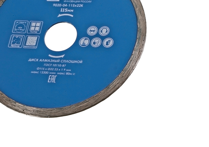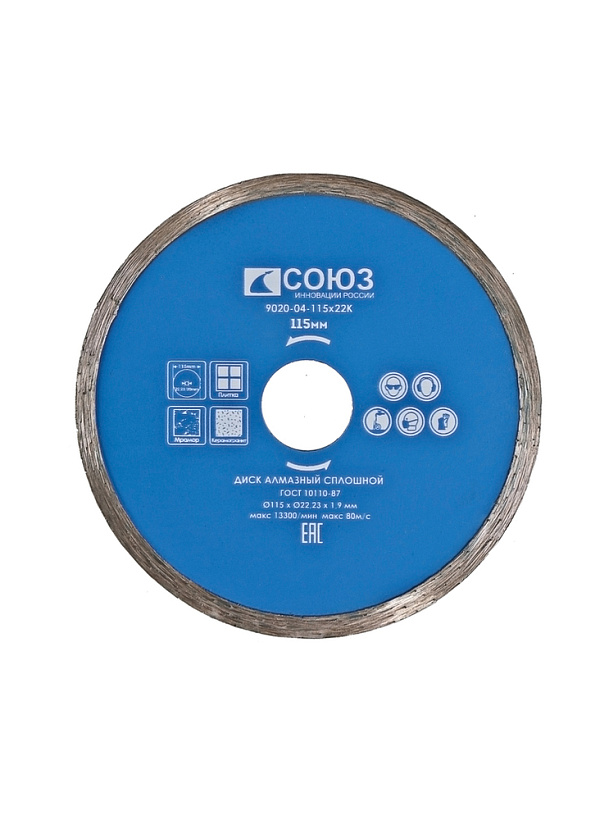 Диск алмазный СОЮЗ 9020-04-115x22К непрерывного типа для мокрой резки обеспечивает аккуратный, ровный рез без сколов керамогранита, керамической плитки, песчаника, травертина, мрамора.