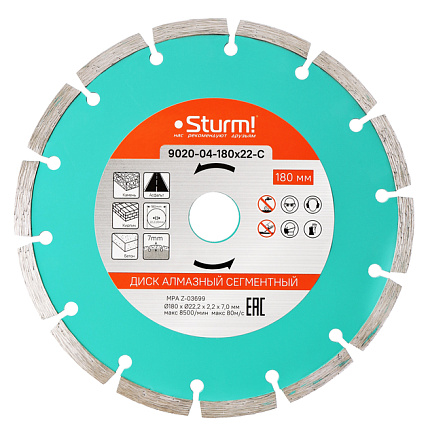 - Диск алмазный Sturm! 9020-04-180x22-C сегментного типа для резки различных материалов: камня, кирпича, бетона, асфальта и тротуарной плитки.