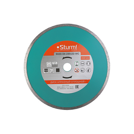 • Диск алмазный Sturm! 9020-04-230x22-WC сплошного типа для резки различных материалов: керамогранита, керамической плитки, песчаника, травертина, мрамора.