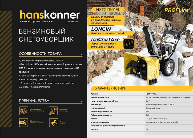 Hanskonner HSTG7661EL — мощный и производительный самоходный бензиновый снегоуборщик с максимальным уровнем оснащения. Предназначен для расчистки территорий средней и большой площади от снега различной плотности, как свежевыпавшего, так и слежавшегося.