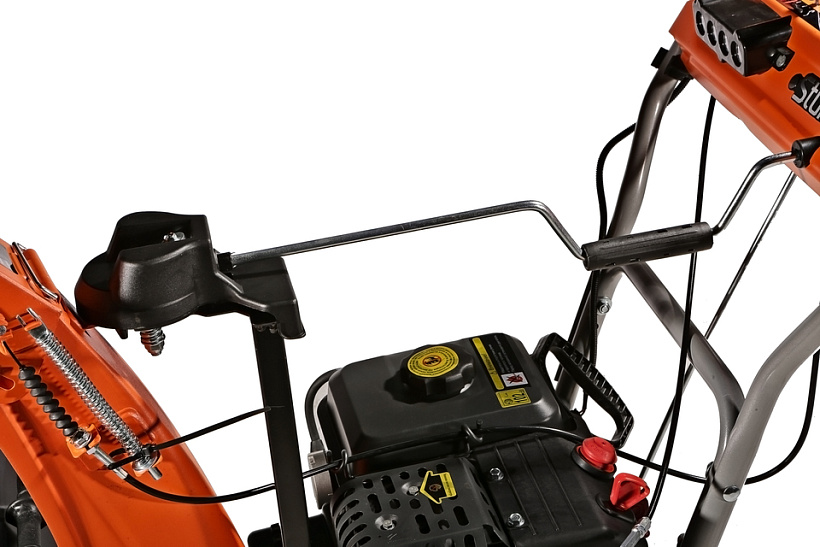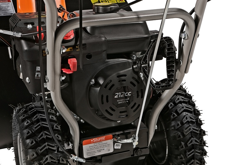 Sturm STG7461EL — универсальный самоходный бензиновый снегоуборщик. Предназначен для расчистки территорий средней и большой площади от снега различной плотности, как свежевыпавшего, так и слежавшегося. Модель оснащена надежным и неприхотливым четырехтактным двигателем KC (рабочий объем 196 см3, мощность 7 л.с.), специально адаптированным для зимней эксплуатации, а также многоступенчатой трансмиссией, значительно повышающей универсальность машины. Конструкцией предусмотрены четыре скорости движения вперед и одна назад. Низшая передача применяется при уборке плотно слежавшегося и мокрого снега, средние передачи — для работы со свежевыпавшим снегом, высшая передача — транспортный режим, предназначенный преимущественно для перемещения снегоуборщика. Важная особенность модели Sturm STG7461EL — наличие системы электрозапуска: благодаря встроенному электростартеру запуск снегоуборщика максимально удобен и прост. При необходимости, пользователь может также осуществлять запуск и с помощью ручного стартера. Высокая производительность машины обеспечивается не только мощным двигателем, но и продуманной конструкцией забора снега — этому способствует использование мощных агрессивных шнеков с большим профилем зуба, позволяющих легко справляться даже со слежавшимся снегом и настом, а также вместительного снегозагребного ковша, гарантирующего внушительную ширину прохода и возможность убирать сугробы до полуметра высотой. Снегоуборщик оснащен надежным металлическим выпускным желобом, с регулировкой по направлению выброса. Поворот желоба осуществляется дистанционно, посредством специального рычага на панели. Кроме того, предусмотрена возможность настройки угла выброса, благодаря которой регулируется необходимое расстояние выброса снежной массы. Максимальная дальность достигает 11 метров. Удобство эксплуатации в сумерках и темное время суток обеспечивает мощная LED-фара — в условиях короткого зимнего дня ее наличие является важной составляющей эффективной работы. Для лучшего сцепления с поверхностью модель комплектуется широкими пневматическими шинами с глубоким протектором.