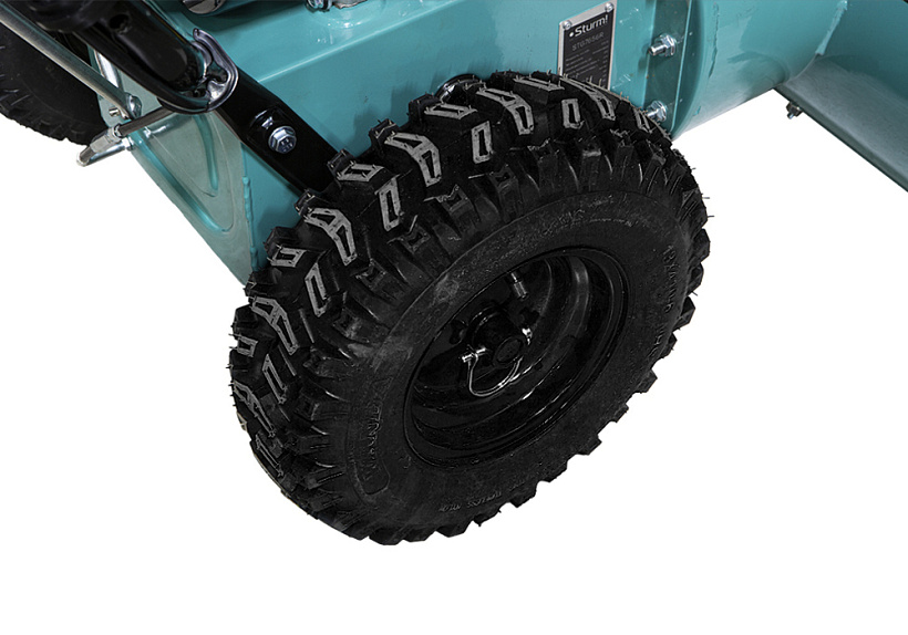 Зазубренный шнек первой ступени успешно измельчает слежавшийся снег и может справиться даже с настом толщиной до 2 см. Высокооборотистая вторая ступень снегоуборочного агрегата отбрасывает снег на расстояние до 12 м. Широкие колеса с развитым анти-снежным протектором позволяют уверенно двигаться по рыхлому снегу.