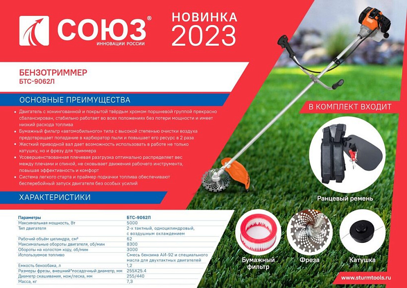Триммер бензиновый СОЮЗ БТС-9062Л – маневренная и легкая в управлении модель, оснащенная мощным двигателем (5 кВт/6,8 л.с.). С его помощью можно скосить траву любой жесткости и обрезать лишнюю растительность в процессе создания ландшафтного дизайна и ухода за зелеными насаждениями. Комбинированная головка обеспечивает быструю подачу режущего корда, что необходимо для непрерывного кошения, повышающего производительность и эффективность работ.