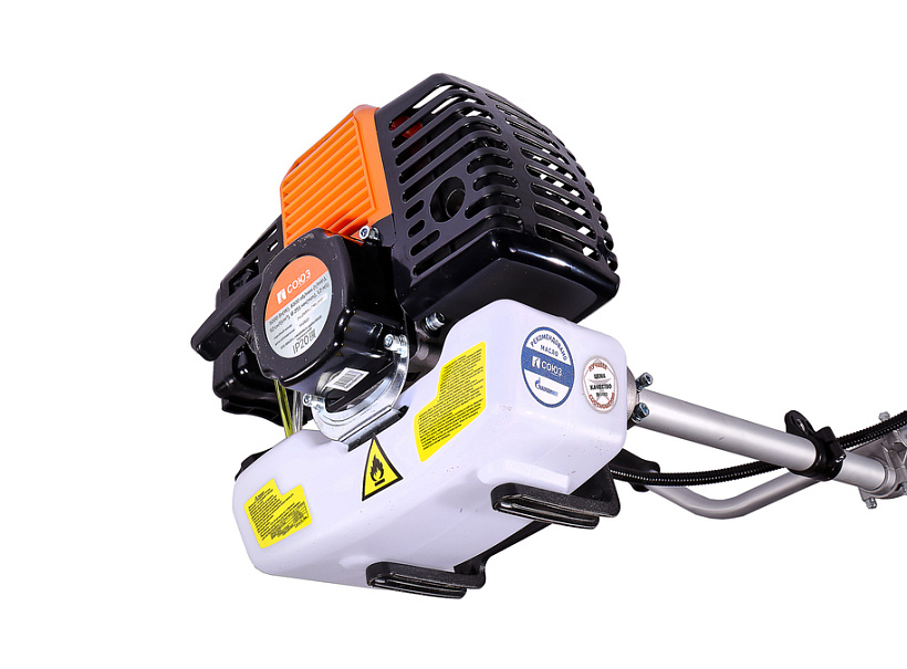 Универсальный защитный кожух подходит для использования с ножом-косой, которая облегчает срезание жестких зарослей, или кордовой головкой для травы. Заменить оснастку при этом можно просто и безопасно. Система легкого старта отвечает за бесперебойный запуск мотора без чрезмерного приложения усилий. Праймер подкачки топлива облегчает включение двигателя в сложных условиях. Наличие возвратного механизма стартера постоянно поддерживает инструмент в готовом к работе состоянии. Это обусловлено тем, что он автоматически приводит его в стартовое положение для быстрого последующего запуска.