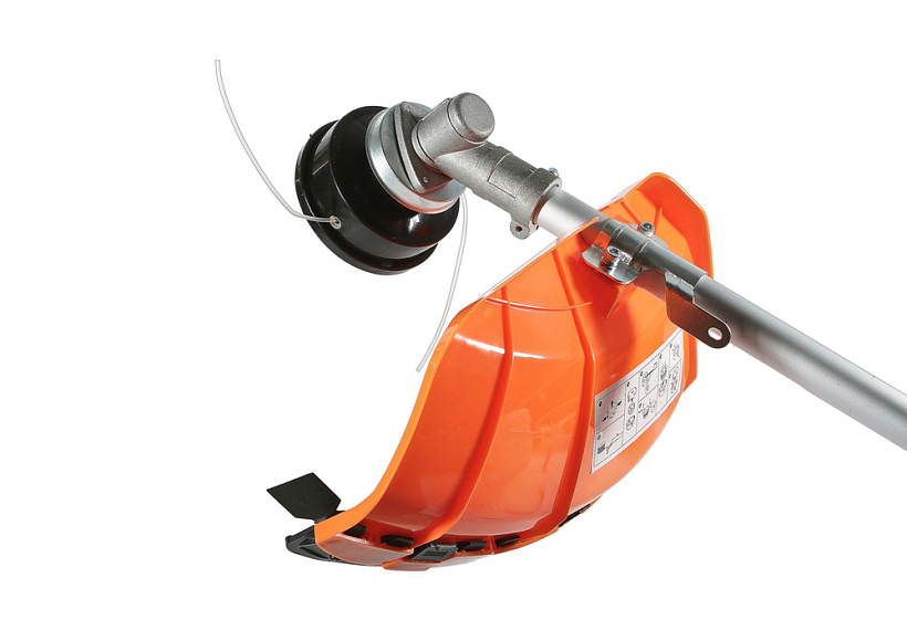 Универсальный защитный кожух можно использовать с ножом- косой для жестких зарослей или кордовой головкой для травы. При этом замена оснастки производится просто и безопасно.