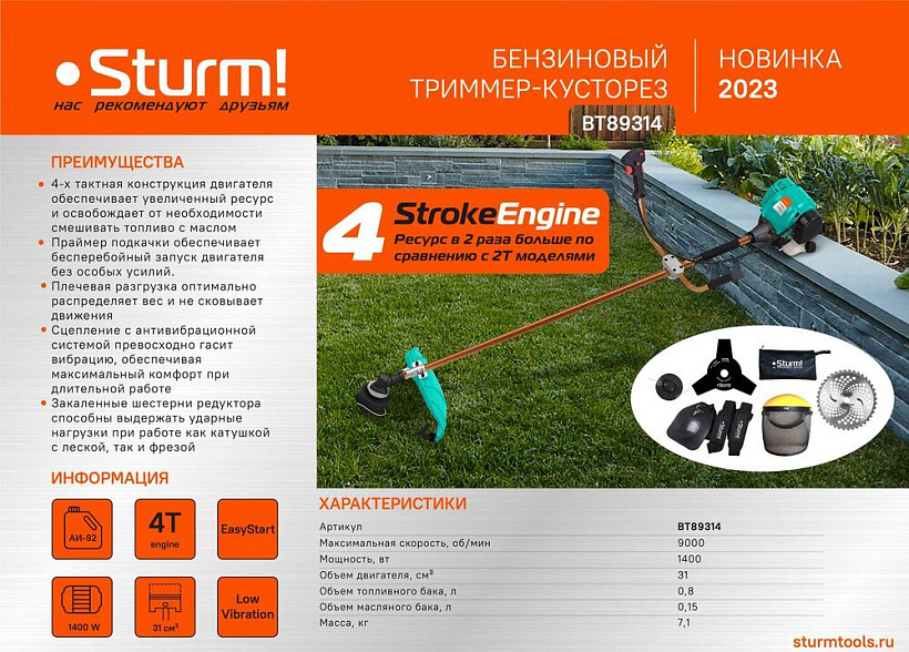 Четырехтактная модель триммера Sturm! BT89314 имеет меньшую вибрацию, позволяя снизить нагрузку на суставы оператора. Это будет особо сильно заметно при длительной работе.