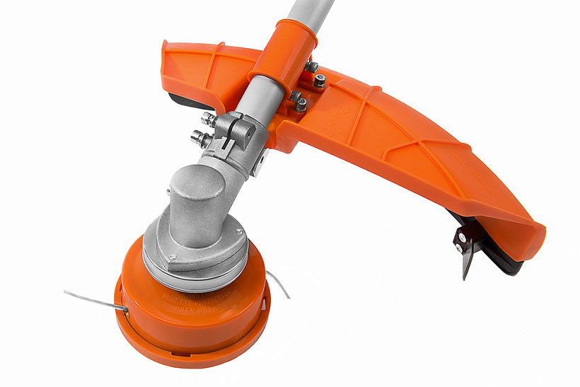 Универсальный защитный кожух можно использовать с ножом- косой для жестких зарослей или кордовой головкой для травы. При этом замена оснастки производится просто и безопасно.