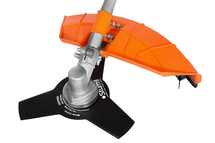 Универсальный защитный кожух можно использовать с ножом- косой для жестких зарослей или кордовой головкой для травы. При этом замена оснастки производится просто и безопасно.