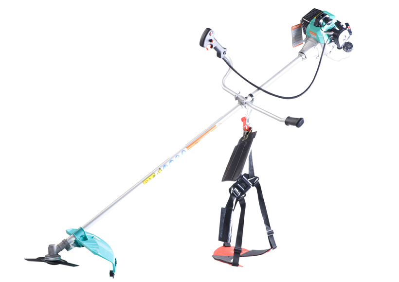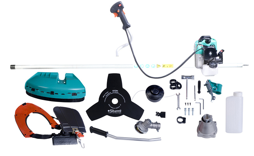 Трехзубчатый нож 1шт Защитный кожух с винтами 1комп. Отвертка с торцевым ключом 1шт Стяжка 1шт Канистра для топливной смеси 1шт Нож для резания лески 1шт Шестигранный ключ 2шт Двухсторонний гаечный ключ 1шт Боковая рукоятка 1шт Двухсторонняя отвертка 1шт Шпулька 1шт