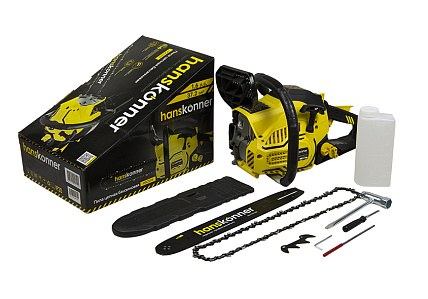 • Безопасность работы обеспечивается предохранительной клавишей, предотвращающей случайное нажатие газа, ограничителем цепи, защитным щитком для правой руки, а также цепным тормозом, активируемым принудительно либо силой инерции.