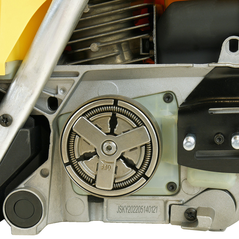 Безопасность работы обеспечивается предохранительной клавишей, предотвращающей случайное нажатие газа, ограничителем цепи, защитным щитком для правой руки, а также цепным тормозом, активируемым принудительно либо силой инерции. Два способа активации тормоза цепи повышают безопасность труда.