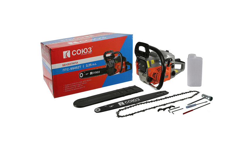СОЮЗ ПТС-99452Т – надежная универсальная бензиновая пила бытового класса. Модель рассчитана на широкий спектр работ: от расчистки лесных насаждений и благоустройства парковых зон до эксплуатации на приусадебных территориях. Оснащена мощным и экономичным двухтактным двигателем рабочим объемом 45 куб см (мощность 2.35 кВт) и пильной гарнитурой увеличенной размерности – 455 мм, что позволяет эффективно использовать инструмент для распиловки древесины различной толщины. Благодаря нейтральному центру тяжести, инструмент отлично сбалансирован, хорошо лежит в руках и позволяет с легкостью выполнять распилы под разными углами. Модель проста в эксплуатации и не вызовет затруднений у пользователей, не обладающих достаточными навыками работы с бензопилами. Легкость запуска гарантируют система облегченного старта со специальной дополнительной пружиной и праймер, позволяющий уверенный пуск инструмента в условиях низких температур и после длительных перерывов в эксплуатации. Возможность безынструментального доступа к карбюратору, фильтрующему элементу и свече зажигания обеспечивает удобство обслуживания пилы даже в самых неприспособленных условиях.