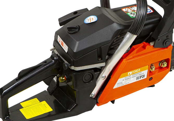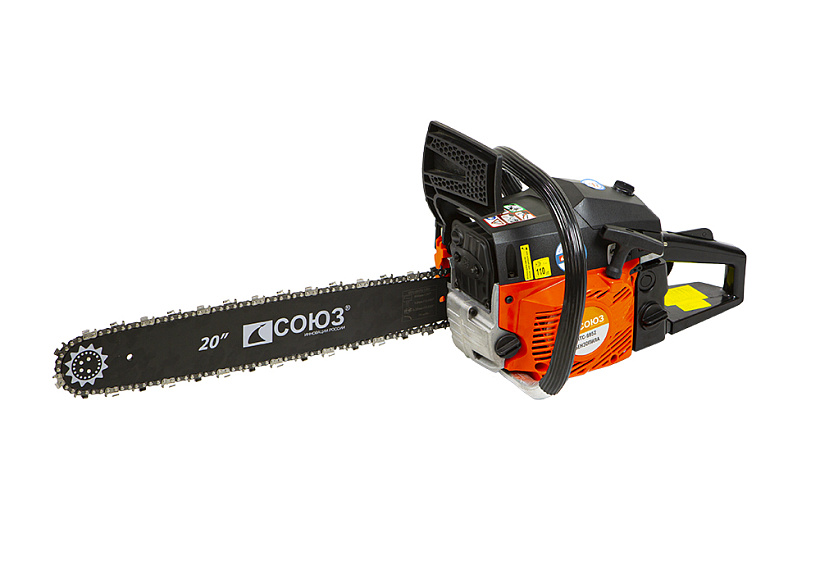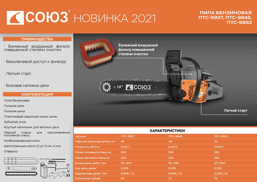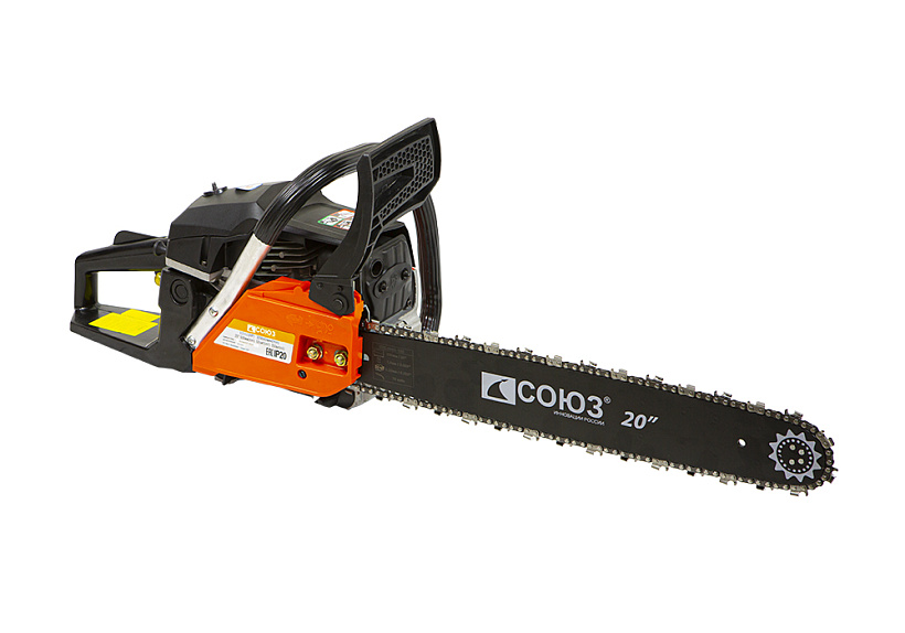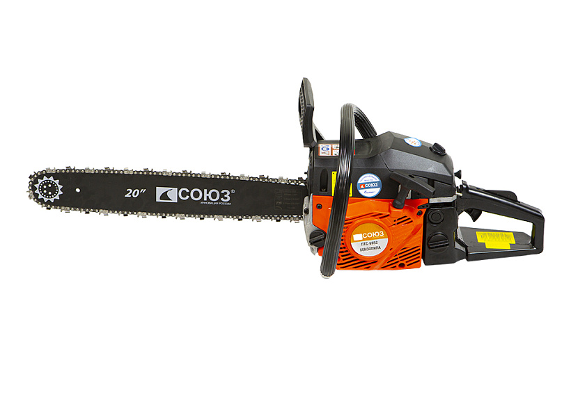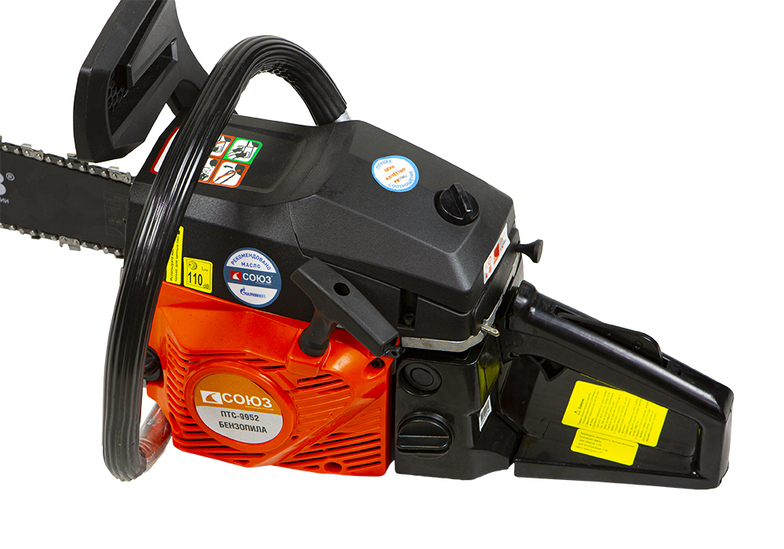 Бензопила СОЮЗ ПТС-9952. "Старшая" модель в данной линейке бензопил. Поставляется с шиной 50 см и двигателем объемом 52 см3. Имеет имеет прочную конструкцию и предоставляет оптимальную мощность для эффективной работы.