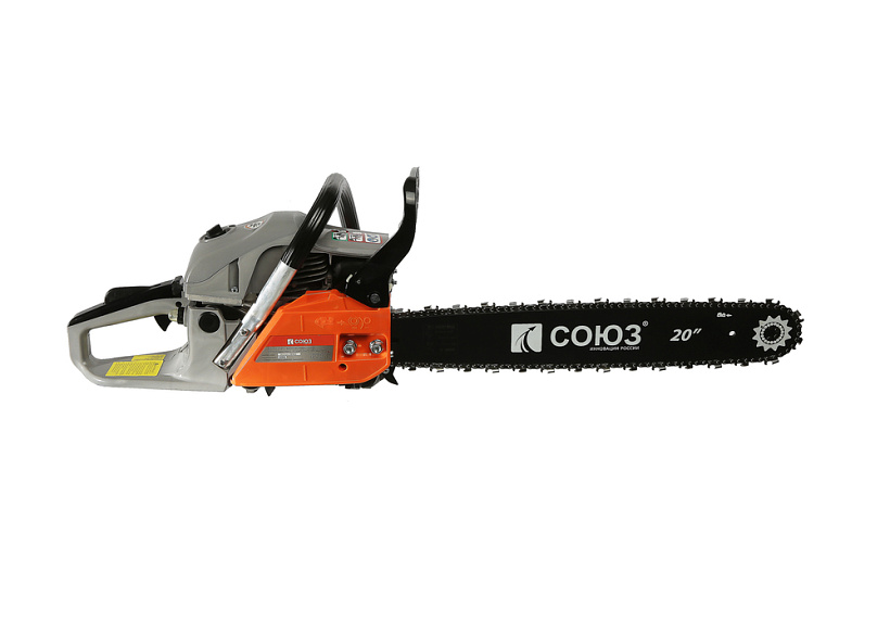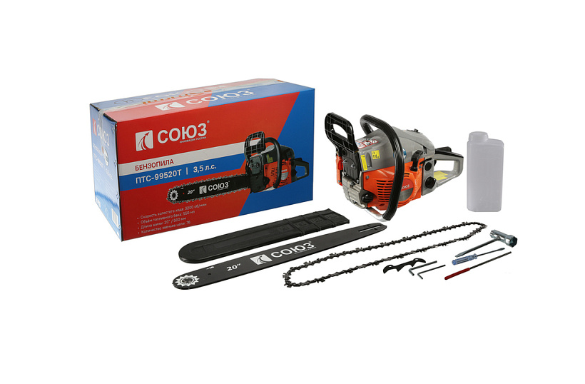 СОЮЗ ПТС-99520Т –  надежная и производительная универсальная бензиновая пила бытового назначения. Модель оснащена одним из самых мощных в классе двухтактным двигателем объемом 52 куб см (мощность 2,6 кВт), рассчитанного на продолжительную работу в режиме повышенных нагрузок: усиленный металлический картер двигателя, хромоникелевое покрытие стенок цилиндра, кованый коленчатый вал, применение двух компрессионных колец на поршне обеспечивают существенный выигрыш в плане надежности и безотказности работы. Пила штатно комплектуется пильной гарнитурой увеличенной размерности – 500 мм – это позволяет, учитывая значительный запас двигателя по мощности и высокую скорость движения цепи, уверенно использовать инструмент при валке высоких деревьев и распиловки стволов большого диаметра.