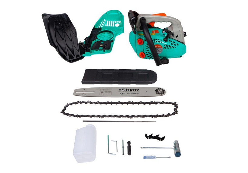 1. Пильная цепь - 1 шт. 2. Пильная шина – 1 шт 3. Пластиковый защитный кожух для шины - 1 шт. 4. Отвертка - 1 шт. 5. Круглый напильник для заточки цепи - 1 шт. 6. Мерный стакан для приготовления топливной смеси - 1 шт. 7. Комбинированный ключ – 1 шт. 8. Шестигранные ключи – 2 шт. (3 мм, 4 мм). 9. Зубчатый упор – 1 шт.