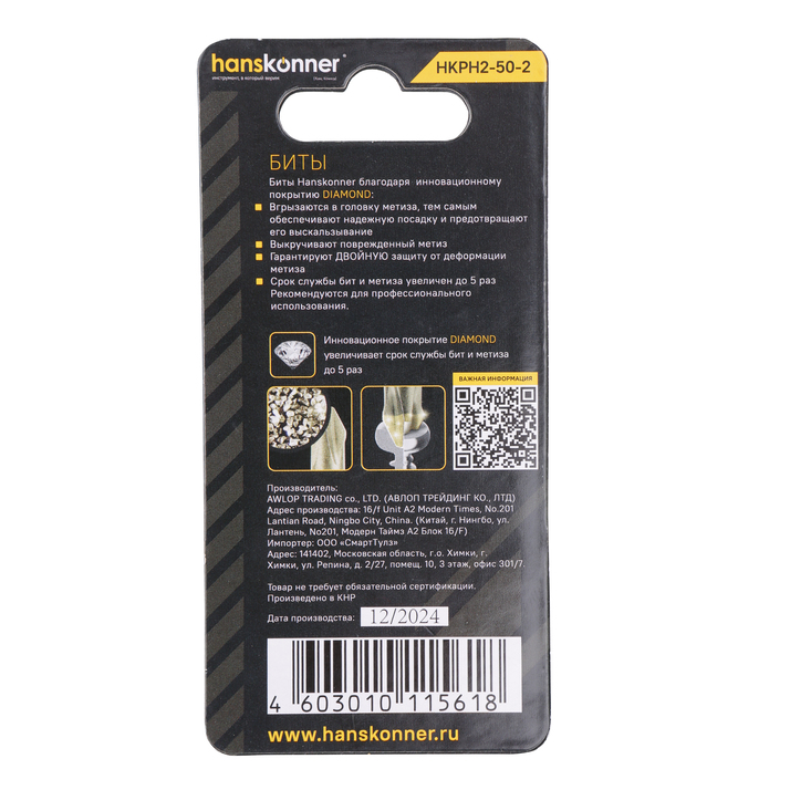 Биты PH2x50мм, сталь S2, Diamond, 2шт,Hanskonner