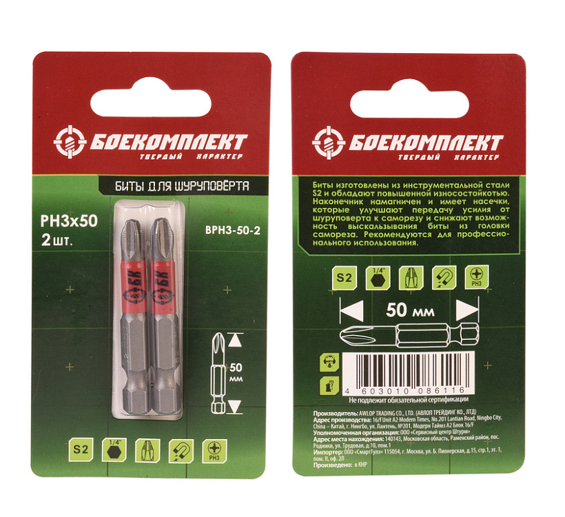 Биты PH3x50мм, сталь S2, 2шт, БОЕКОМПЛЕКТ
