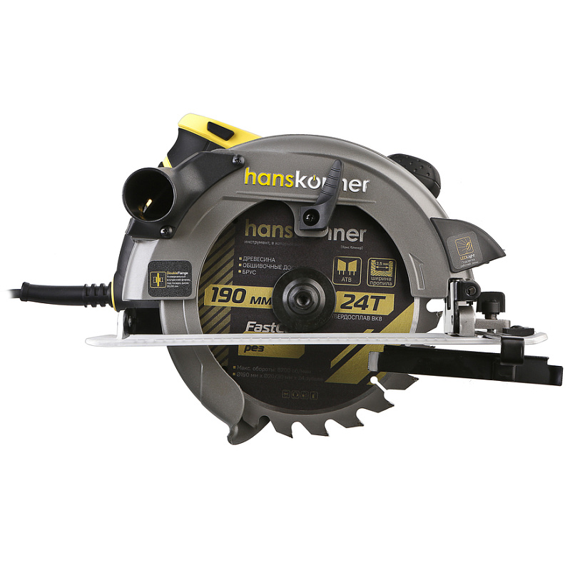 Hanskonner HCS50190 –надежная и производительная циркулярная пила под рабочий диаметр пильного диска 190 мм с возможностью стационарного крепления. Пила оснащена 1800 Вт электродвигателем MaxPower, высокопрочным редуктором и фирменными пылезащищенными подшипниками, благодаря чему способна выполнять больший объем работ в сравнении с бытовыми аналогами, и демонстрирует высокую эффективность не только с мягкими, но и твердыми породами древесины. Максимальная глубина пропила – 65 мм. Важная особенность модели Hanskonner HCS50190 – наличие блока константной электроники EPM (Electronic Power Manager), предотвращающего снижение рабочих оборотов под нагрузкой и обеспечивающего плавный запуск. Инструмент получил не склонную к деформации литую алюминиевую платформу, гарантирующую высокое качество производимого реза. Предусмотрена возможность точной настройки пилы на необходимую глубину пропила, а также возможность выполнения резов на угол от 0 до 45 градусов. Фиксация опорной платформы в требуемом наклонном положении осуществляется безыинструментальным способом – с помощью специального зажимного рычага, что значительно ускоряет и облегчает настройку перед работой. Для большего удобства пользователя модель имеет LED подсветку рабочей зоны, обеспечивающую отличную видимость линии реза даже при недостаточном освещении, а также функцию блокировки вала шпинделя, гарантирующую максимально быструю замену оснастки. Предусмотрена функция быстрого доступа к щеткам QuickChange, дающая возможность их быстрой замены, без демонтажа элементов корпуса. Благодаря применению сетевого кабеля 4VelcroRubber с резиновой изоляцией, в полной мере сохраняется его гибкость и эластичность в условиях низких температур. Четырехметровая длина кабеля обеспечивает рабочую зону площадью до 50 м2, а фиксатор-липучка способствует удобству хранения. Наличие патрубка позволяет подключать к инструменту строительный пылесос.