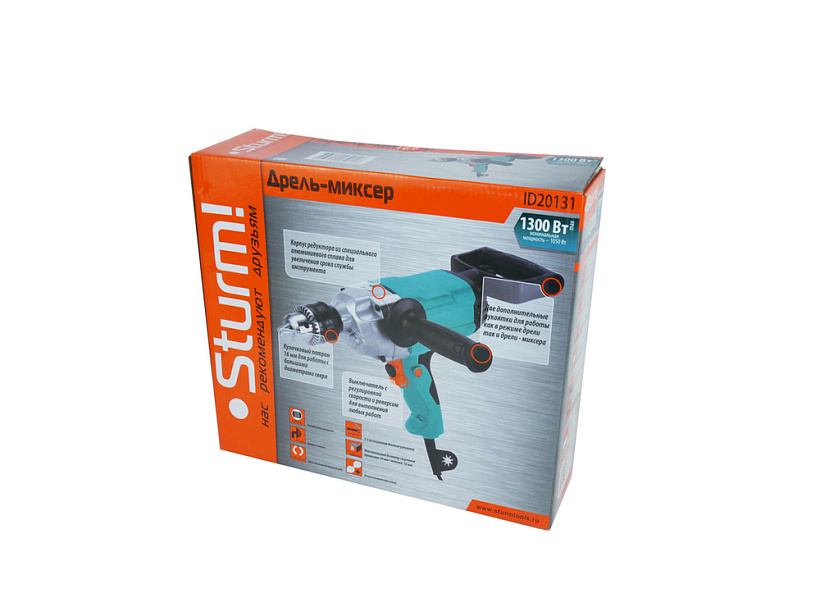 Электрический дрель-миксер Sturm! ID20131 — многоцелевой и мощный электроинструмент для сверления отверстий большого диаметра, размешивания растворов, краски, строительных смесей. Данная модель обладает одним из самых высоких крутящих моментов в этом классе инструментов, а также ограничителем скорости вращения, что содействует выполнению особенно трудных задач. Долговечности инструмента способствует металлический корпус редуктора, обеспечивающий повышенную прочность узла и лучшее охлаждение редуктора в условиях повышенных нагрузок.