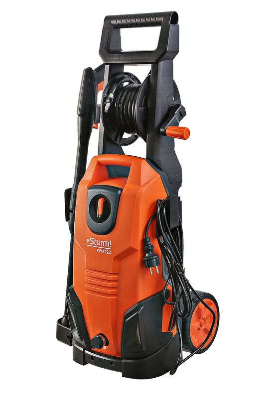 Sturm PW9223 – универсальная мойка высокого давления для бытового использования. Представляет оптимальное сочетание производительности, выверенной эргономики, и широкого функционала. Модель оснащена мощным 2300 Вт электромотором и трёхплунжерной алюминиевой помпой, обеспечивающей производительность в 450 л/час, и высокие показатели по выходному давлению (максимальное давление – 165 бар / рабочее давление – 110 бар) – все это способствует быстрому и эффективному удалению даже самых стойких загрязнений. Входной и выходной патрубки помпы также изготовлены из алюминия, что повышает механическую прочность изделия. Важная особенность мойки Sturm PW9223 – наличие функции самовсасывания, позволяющей полноценную эксплуатацию устройства даже при отсутствии условий для подключения к стационарному водопроводу, используя для забора открытые источники: ведро, бочку или бак. Модель комплектуется длинным семиметровым шлангом высокого давления, обеспечивающим значительную рабочую площадь: с его помощью можно свободно мыть легковой автомобиль, очищать крыши дачных построек и другие объекты без необходимости передвигать мойку с места на место. Для защиты шланга от нежелательных перегибов предусмотрена штатная катушка для его намотки. Легкости подключения шланга и оснастки способствуют специальные быстросъемные соединения QuickConnect. . Безопасную, энергосберегающую и долговечную работу мойки гарантируют встроенная термозащита и автоматическая система с микровыключателем мгновенной остановки двигателя Total Stop. Удобство перемещения достигается благодаря большим транспортировочным колесам.