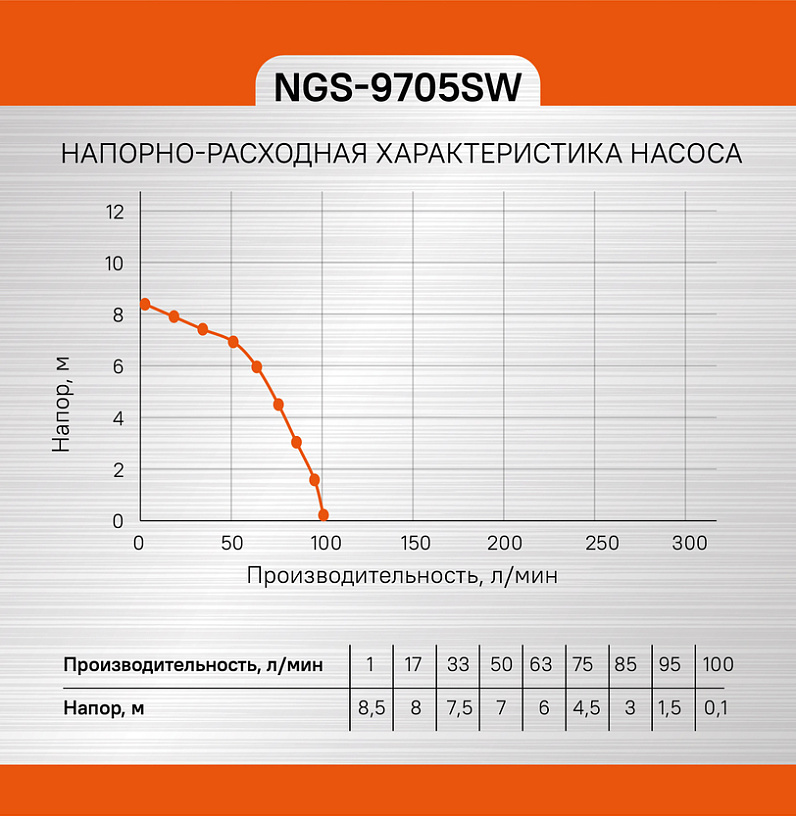 СОЮЗ НГС-9705СВ – погружной дренажный насос – предназначен для откачивания жидкости из выгребных ям, септиков, канализационных коллекторов. Имеет комбинированный корпус: основание выполнено из прочного чугуна – это необходимо для свободного погружения насоса в сточные водные массы, корпус двигателя – из нержавеющей стали, стойкой к воздействию агрессивной среды.  При мощности электромотора в 500 Вт модель характеризуется высокой производительностью – способна перекачивать за час до 6000 литров жидкости и обеспечивать ее подачу на высоту до 8,5 метров, осуществляя забор с глубины до 5 метров. Максимальная температура жидкости для насоса не должна превышать 35 градусов. Важная особенность модели СОЮЗ НГС-9705СВ – наличие в конструкции специального режущего узла, позволяющего измельчать крупные фракции, а также изготовленной и нержавеющей стали крыльчатки, устойчивой к окислительным воздействиям. Кроме того, насос снабжен устройством автоматического удаления воздушных пробок и имеет регулируемый поплавковый выключатель, который автоматически способен включать / выключать насос в зависимости от изменения уровня вод. Предусмотрена встроенаая термозащита – она автоматически отключает насос при перегреве и позволяет возобновить работу при последующем остывании до рабочей температуры.