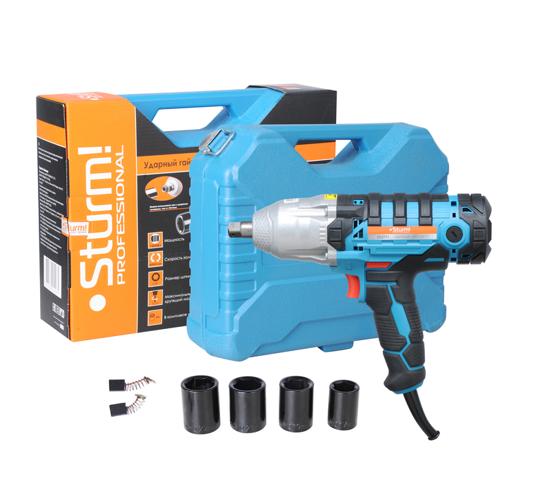 Sturm ID2111 – cетевой ударный гайковерт с наружным квадратом 1/2″ и возможностью установки оснастки под шестигранник 1/4″. Модель имеет современный дизайн и оптимальную компоновку со смещенной вперед рукоятью, что обеспечивает нейтральный центр тяжести и положительно сказывается на удобстве использования. Прорезиненные накладки на элементах корпуса и рукояти способствуют надежному хвату, а также обладают защитными функциями: амортизируют удар при случайном падении и удерживают инструмент на наклонных поверхностях, препятствуя его скольжению. Прочный металлический корпус редуктора способствует лучшему отводу тепла при работе. Гайковерт оснащен производительным 1000 Вт электродвигателем и в тандеме с мощной механической частью демонстрирует высокие показатели по крутящему моменту (380 Н м). Одной из особенностей Sturm ID2111 является наличие длинного морозостойкого четырехметрового сетевого кабеля 4VelcroRubber, обеспечивающего рабочую зону площадью до 50 м2. Для удобства обслуживания, конструкцией предусмотрен быстрый доступ к щеткам, что дает возможность их замены без демонтажа элементов корпуса. Прочный пластиковый кейс гарантирует сохранность устройства и аксессуаров в процессе транспортировки. В комплектацию гайковерта включен набор высокопрочных головок 17 мм, 19 мм, 21 мм, 22 мм.