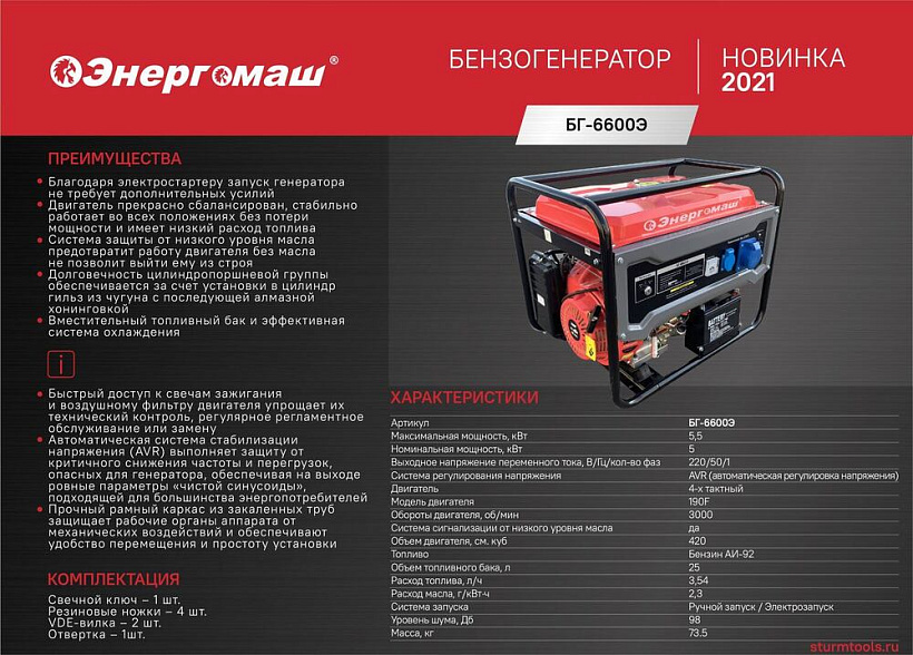 *Для работы генератора подходит бензин АИ-92 *Мотоциклетный глушитель снижает уровень шума *Оснащен промышленной розеткой 32 А для питания мощных потребителей *Система защиты от низкого уровня масла предотвратит работу двигателя без масла не позволит выйти ему из строя *Стартер ручной/электро