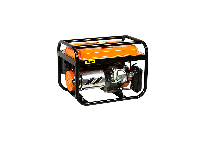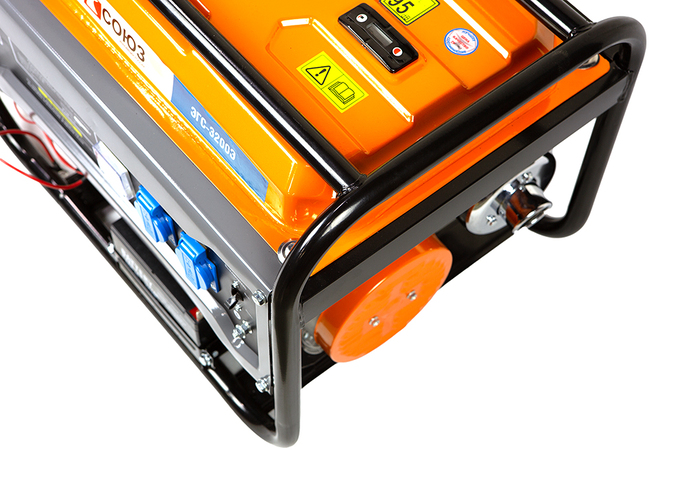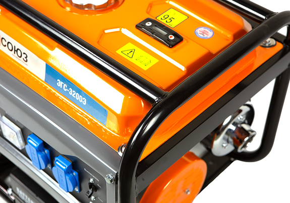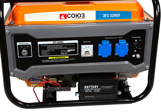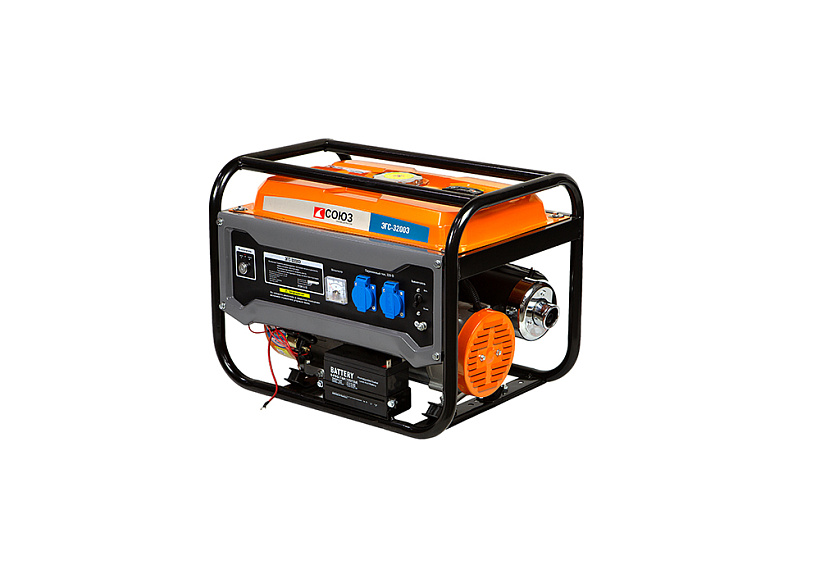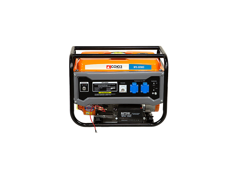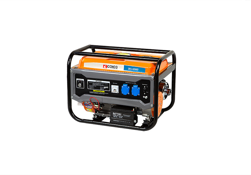 СОЮЗ ЭГС-3200Э – универсальный однофазный бензиновый генератор. Максимальная мощность –3.0 кВт. Номинальная мощность – 2.5 кВт. Отлично подойдет для резервного электроснабжения загородного дома или организации удаленной рабочей площадки. Имеет классическую компоновку: двигатель и альтернатор смонтированы внутри прочной усиленной трубчатой рамы, страхующей узлы генератора и бензобак от случайных повреждений, при транспортировке. Главная отличительная особенность СОЮЗ ЭГС-3200Э – наличие системы электрического запуска с помощью встроенного электростартера. Также, в качестве альтернативы, в случае необходимости, всегда можно задействовать и традиционный вариант запуска – с помощью ручного стартера Модель оснащается четырехтактным бензиновым двигателем 170F рабочим объемом 212 см3 с верхним расположением клапанов (OHV) и воздушным охлаждением. Тип альтернатора – синхронный, с щеточно-коллекторным узлом. Синхронный альтернатор способен легко переносить индуктивные нагрузки и позволяет запитывать даже достаточно мощный строительный электроинструмент. За автоматическую стабилизацию выходного напряжения отвечает встроенная система AVR (Automatic Voltage Regulation). Панель управления оснащена контрольным аналоговым вольтметром, а также двумя пылезащищенными розетками переменного тока 220В на 16А с автоматическими подпружиненными крышками. Предусмотрена система поддержания энергобезопасности, принудительно отключающая агрегат при превышении допустимой нагрузки или коротком замыкании, а также система аварийной остановки двигателя при критически низком уровне масла.