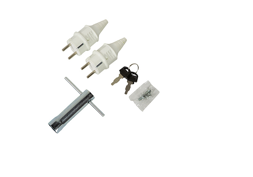 1. Свечной ключ-1шт. 2. Резиновые ножки – 4 шт. 3. VDE-вилка – 2 шт. 4. Отвертка -1шт. 5. Ключ зажигания – 2шт. 6. Болт – 2шт.