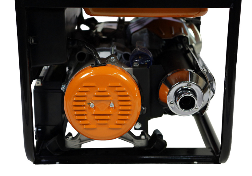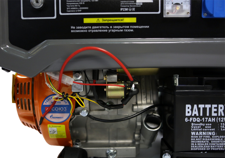 СОЮЗ ЭГС-6500Э – мощный универсальный однофазный бензиновый генератор для частного или производственного использования. Отлично подойдет для резервного электроснабжения загородного дома или организации удаленной рабочей площадки. Имеет классическую компоновку: двигатель и альтернатор смонтированы внутри прочной усиленной трубчатой рамы, страхующей узлы генератора, и бензобак от случайных повреждений, при транспортировке. Модель оснащается четырехтактным бензиновым двигателем 190F рабочим объемом 420 см3 с верхним расположением клапанов (OHV) и воздушным охлаждением. Благодаря ряду технических решений: коленчатому валу повышенной прочности, усиленной цилиндро-поршневой группе, чугунной гильзе цилиндра и ее алмазной хонинговке силовой агрегат надежен, и неприхотлив в использовании. Тип альтернатора – синхронный, с щеточно-коллекторным узлом. Синхронный альтернатор способен легко переносить индуктивные нагрузки и позволяет запитывать даже достаточно мощный строительный электроинструмент. За автоматическую стабилизацию выходного напряжения отвечает встроенная система AVR (Automatic Voltage Regulation). Для визуального контроля напряжения на панели размещен аналоговый вольтметр. Важная особенность модели СОЮЗ ЭГС-6500Э – система электрического запуска, за счет чего пуск бензогенератора максимально удобен и прост. В качестве альтернативы, можно задействовать и традиционный вариант запуска с помощью ручного стартера. Генератор имеет систему поддержания энергобезопасности, которая принудительно отключает агрегат при превышении допустимой нагрузки или коротком замыкании, а также оснащен системой аварийной остановки двигателя при критически низком уровне масла.