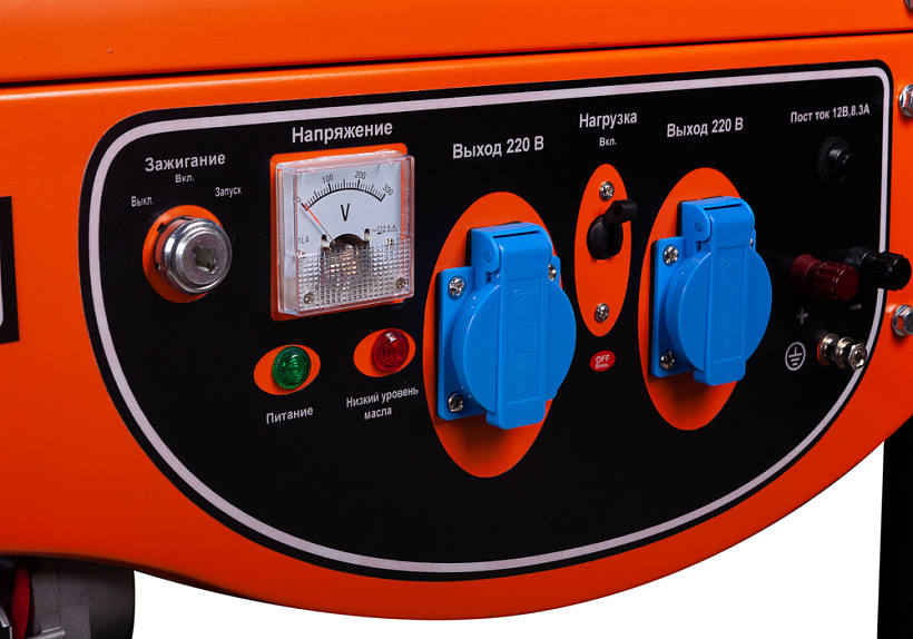 Панель управления оснащена контрольным вольтметром, двумя пыле-влагозащищенными розетками переменного тока 220В/16А с автоматическими крышками и клеммным выходом постоянного тока 12В/ 8,3А для универсального обеспечения электропитания потребителей различного класса.