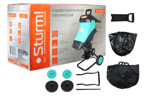 Sturm GES2550 – мощный и производительный садовый измельчитель – предназначен для быстрой и эффективной переработки веток, стеблей, и других твердых растительных отходов. Позволяет максимально упростить процесс их утилизации. Инструмент обладает относительно небольшими габаритными размерами и массой, за счет чего не занимает много места при хранении. Удобству перемещения по территории способствует наличие транспортировочных колес и рукояти. Корпус измельчителя выполнен из высокопрочного пластика, что положительно сказывается на общем сроке службы инструмента. Модель оснащена мощным 2500 Вт электродвигателем и режущим элементом с ножами из высокопрочной стали – способна уверенно измельчать достаточно крупные сучья и ветки диаметром до 40 мм, превращая их в мульчу, с помощью которой впоследствии создаются необходимые условия для благоприятного развития растений. Для обеспечения равномерной подачи веток к режущему элементу, а также безопасности пользователя, инструмент комплектуется специальным толкателем. Также, в штатную комплектацию модели Sturm GES2550 включен вместительный 50-ти литровый мешок для сбора измельченного материала.