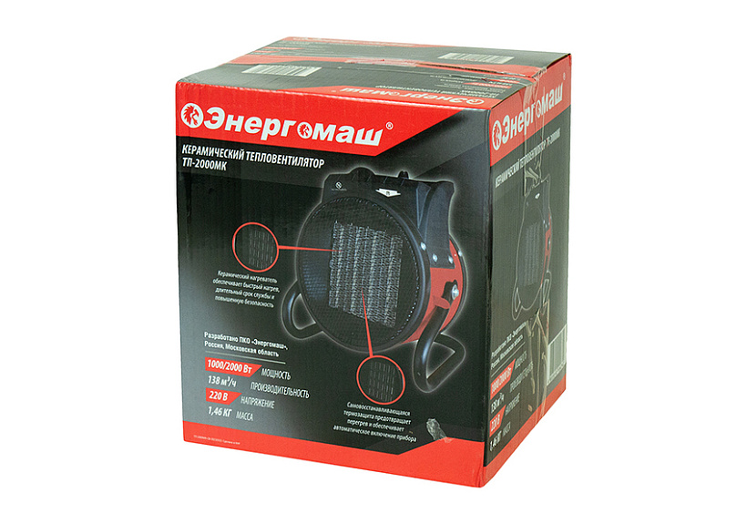 Керамический обогреватель Энергомаш ТП-2000МК. Керамический нагревательный элемент обеспечивает высокую эффективность тепловентилятора. За счет большой площади нагревательного элемента вентилятор разгоняет максимально возможное количество нагретого воздуха в единицу времени, что обеспечивает высокую интенсивность нагрева помещений. Компактные размеры тепловентиляторов серии МК при сохранении показателей эффективности нагрева. Три режима работы: вентилятор / теплый / горячий позволяют использовать тепловентилятор как для обогрева разной интенсивности в холодное время года, так и для вентиляции летом. Регулируемый термостат позволяет устанавливать уровень нагрева внутри режимов. Встроенная термозащита автоматически остановит тепловентилятор при достижении критической температуры. При этом вентилятор прибора продолжит работу предохраняя внутренние части от перегрева. Автоматическое включение произойдет при остывании до рабочей температуры.
