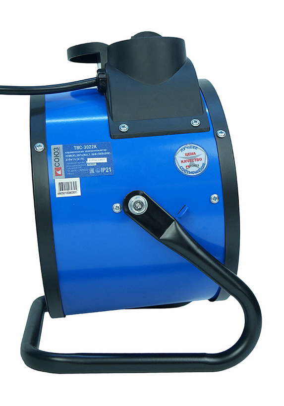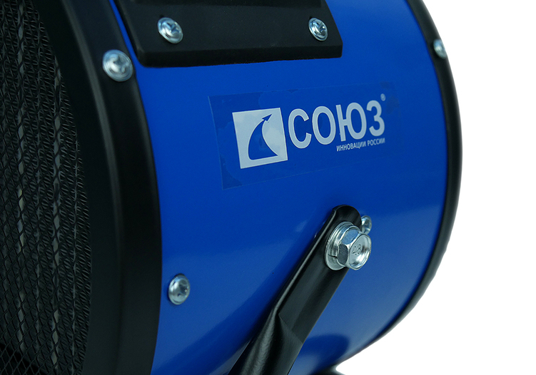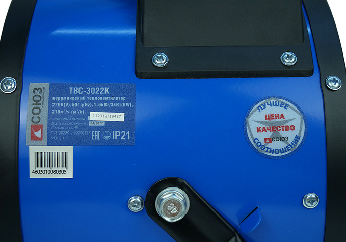 СОЮЗ ТВС-3022К — мощный керамический обогреватель мощностью 3кВт и производительностью воздушного потока 210 м3 / ч. Предназначен для временного или постоянного обогрева жилых, производственных и вспомогательных помещений площадью до 40 м2. Особенность модели — наличие в конструкции металлокерамического нагревательного элемента, благодаря большой площади теплоотдающей поверхности которого гарантируется быстрый нагрев. Обогреватель не сушит воздух и не выделяет вредных веществ.  Для того, чтобы обеспечить высокую производительность воздушного потока, проходящего через нагревательный элемент и ускорить циркуляцию нагретого воздуха в помещении, обогреватель оснащен встроенным мощным вентилятором с металлической крыльчаткой. Управление устройством осуществляется парой регуляторов, расположенных на верхней панели. С помощью первого регулятора пользователь выбирает один из трех режимов работы: вентиляция без нагрева / теплый обдув / горячий обдув. Второй регулятор — управление настройкой термостата, задача которого — поддержание постоянной температуры в помещении. Визуальному контролю включенного устройства способствует отдельный индикатор питания, размещенный на панели управления. Предусмотрена возможность наклона корпуса обогревателя в вертикальной плоскости относительно поверхности, на которой он установлен, что позволяет направлять воздушный поток в соответствии с пожеланиями пользователя. Случайное опрокидывание устройства предотвращает широкая опорная подошва по его периметру.