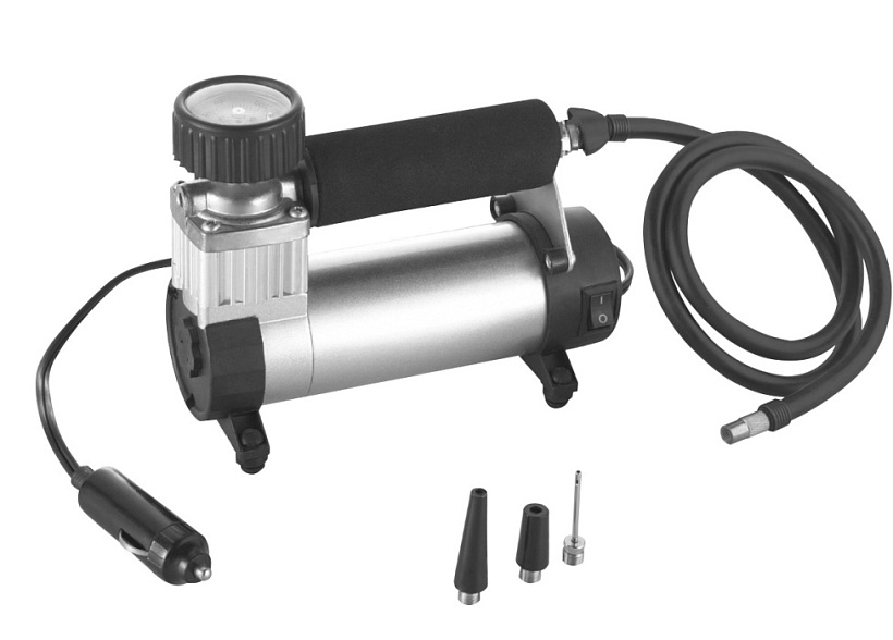 В комплект входит набор насадок-переходников, который делает компрессор универсальным в использовании.
