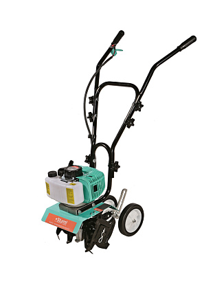 • Транспортировочная колесная база при работе опрокидываются вверх, позволяя пользователю правильно выставить глубину обработки при помощи сошника.