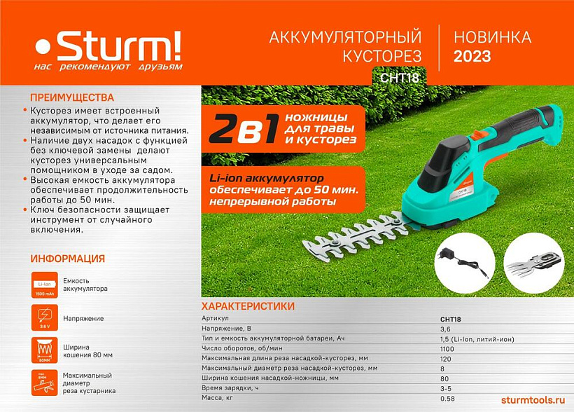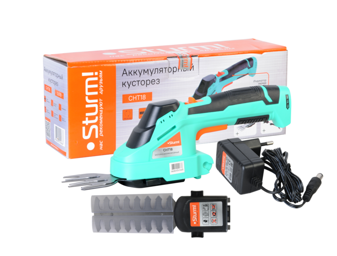Sturm CHT18 – универсальный 3.6В аккумуляторный кусторез 2 в 1 – предназначен для обрезки плодовых деревьев, кустарников и других растений на садовых участках или придомовых территориях. Инструмент обладает отличными массогабаритными показателями, а также эргономичной формой корпуса с обилием прорезиненных элементов, что положительно влияет на удобство использования. Отсутствие привязки к электросети обеспечивает свободу перемещения, а также возможность эффективной работы в условиях с затрудненным доступом. Конструкция кустореза Sturm CHT18 предусматривает установку нескольких отдельных режущих насадок (поставляются в комплекте с инструментом): насадки-кустореза для формовки крон и стрижки кустарников, с шириной захвата в 120 мм за один проход, а также насадки-ножниц, для обрезки травы и мелких растений на газонах, и участках, с шириной захвата до 80 мм. Благодаря быстросъемному креплению, смена насадок производится без применения вспомогательного инструмента. Модель Sturm CHT18 оснащена встроенным литий-ионнным (Li-ion) аккумулятором емкостью 1.5 Ач, гарантирующим продолжительность автономной работы до 50 минут. Предусмотрен индикатор заряда, способствующий визуальному контролю уровня заряда аккумулятора. Для безопасности пользователя, кусторез имеет защиту от случайного запуска.