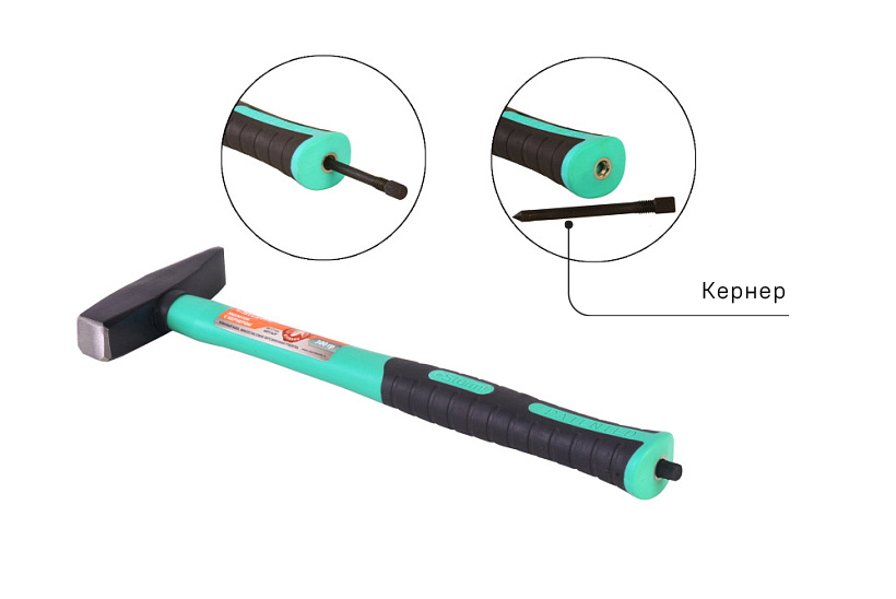 Уникальная запатентованная система крепления кернера позволяет хранить его прямо в рукоятке. Переход от основной работы к разметке и обратно стал максимально быстрым, что в разы экономит время. Кованый боёк молотка, защита от раскола, обрезиненная фиберглассовая рукоятка амортизирует удар и создаёт удобный захват.