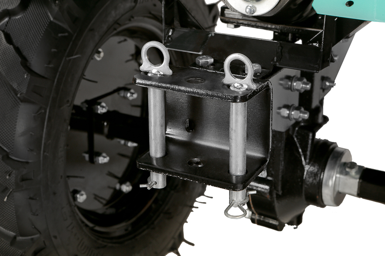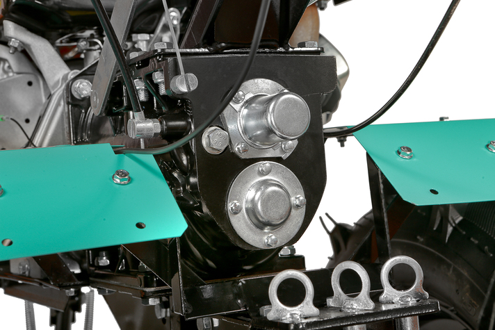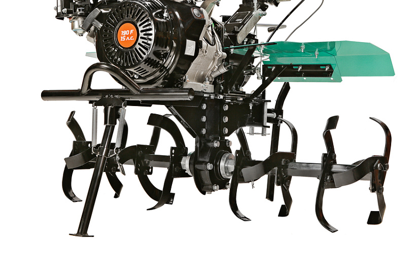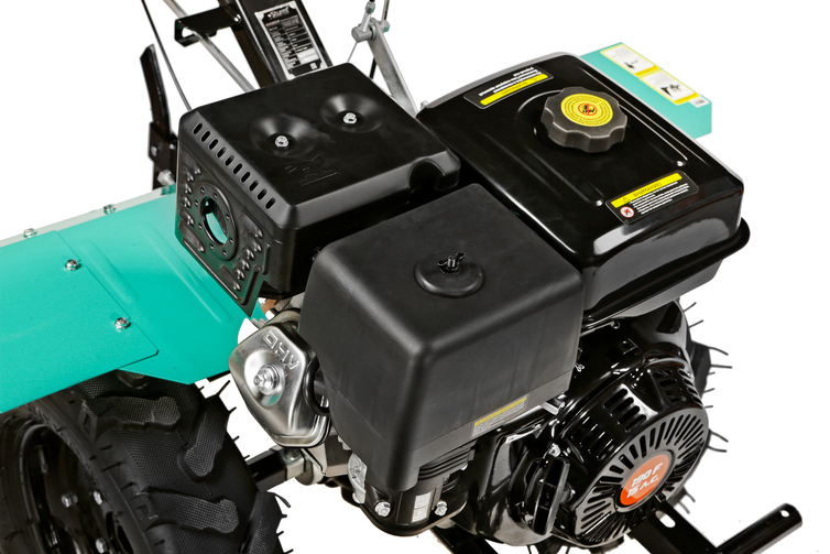 Мотоблок оснащен мощным 4-х тактный одноцилиндровым двигателем, мощностью 15 л.с. объемом 420 см3 и многоступенчатым редуктором, которые позволяют обрабатывать, за один проход, полосу земли шириной 1 м. При использовании пневматических колес, мотоблок с легкостью управляется с прицепом.