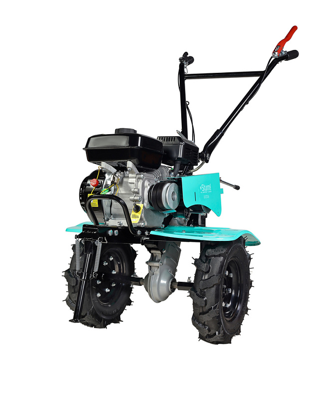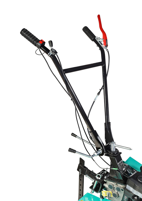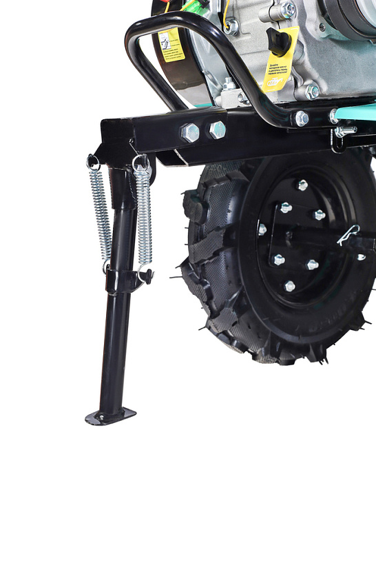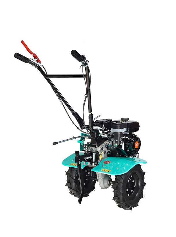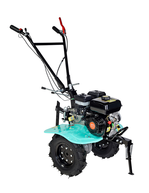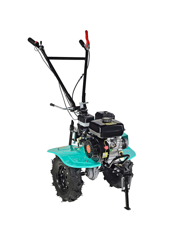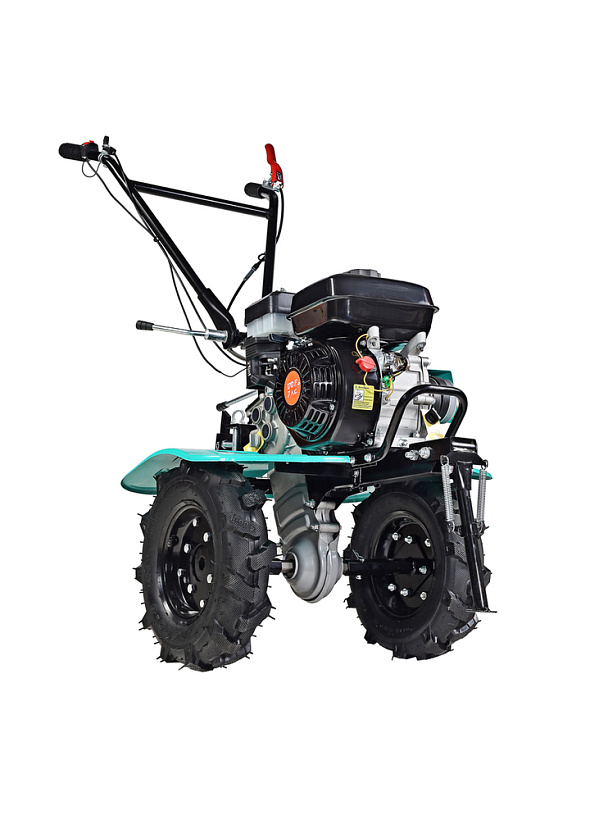 В оснащение мотоблока входит трансмиссия на основе трехступенчатого редуктора (2 ступени переднего хода и одна заднего) с реверсом, пара устойчивых ведущих колес, удобная система управления (рычаги и тумблеры непосредственно на руле). Есть набор устанавливаемых фрез. Ведущие колеса мотоблока – это пара стальных дисков с пневматическими шинами, с «болотным» протектором, не допускающим пробуксовки.